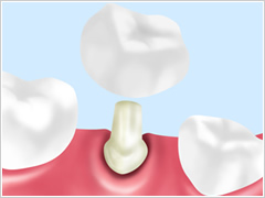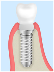 インプラント治療は、歯が失われた部分の顎の骨にチタン製の人工歯根(インプラント)を直接埋め込むことで、歯の機能を回復させる治療法です。上部には見た目も硬さも天然歯と遜色ない人工歯を装着することができます。重度の歯周病では歯や顎の骨を失ってしまうケースが多くありますが、再び自分の歯で噛めるようになるためのチャンスとなる治療法の一つです。
